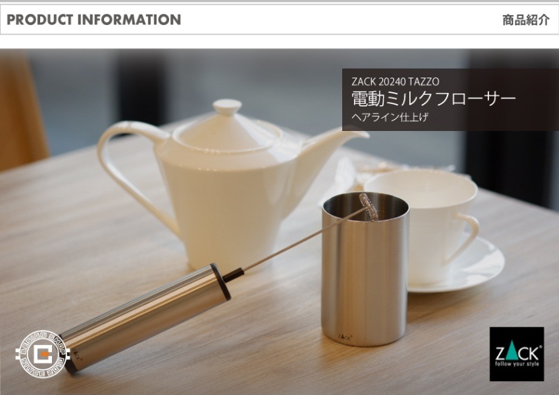 ZACK 20240 TAZZO ミルクフローザードイツのデザインブランド ZACK(ツァック) が手がけた、シンプルで美しいミルクフローザー。2020年2月、フランクフルト・アンビエンテで発表されたこのモデルは、ラテやカプチーノなどのミルク泡立てを、まるでカフェのようなクオリティで実現します。