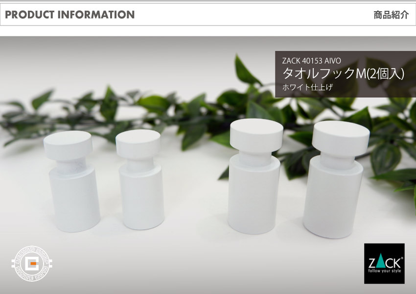 ZACK「AIVO」シリーズのタオルフックMは、シンプルな造形の中に繊細な美しさを宿す、ミニマルデザインのタオルフックです。直径1.9cm・長さ4cmという非常にコンパクトなサイズでありながら、18/10ステンレス製の堅牢なボディとマットホワイト仕上げの柔らかい質感が空間に洗練されたアクセントを加えます。