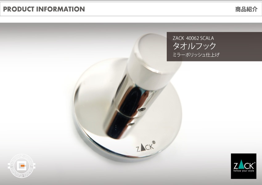 ZACK > 仕上げ方法 > 鏡面仕上げ > ZACK 40062 SCALA ドイツZACK社製モダンデザインのタオルフック 壁付けタイプ DIY MP [在庫有り]