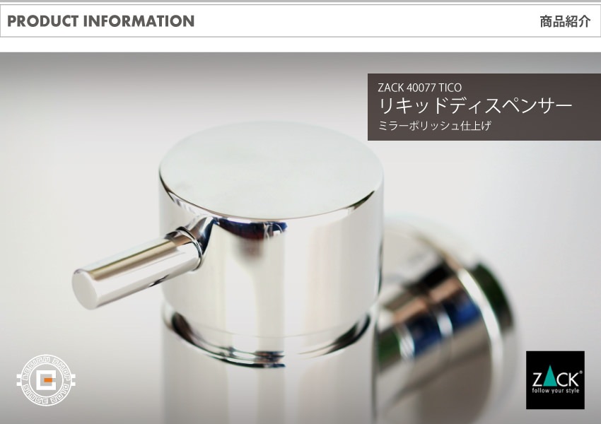 トップ > ZACK MUSEUM > [廃番] ZACK 40077 TICO ドイツZACK社製モダンデザインのリキッドディスペンサー 壁付けタイプ DIY
