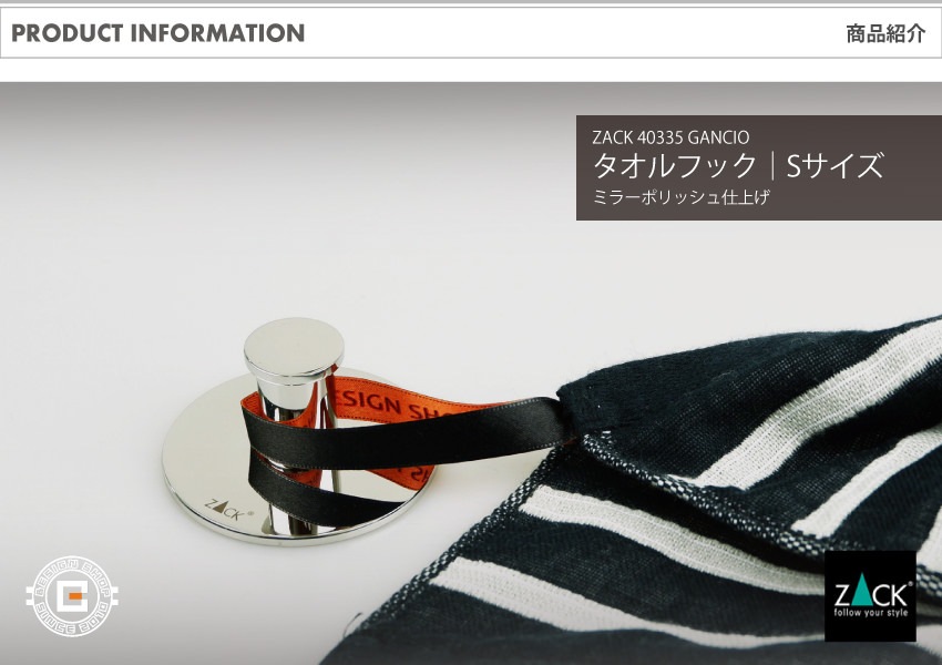 トップ > ZACK MUSEUM > [廃番] ZACK 40335 GANZIO ドイツZACK社製モダンデザインのタオルフックS 壁付けタイプ DIY
